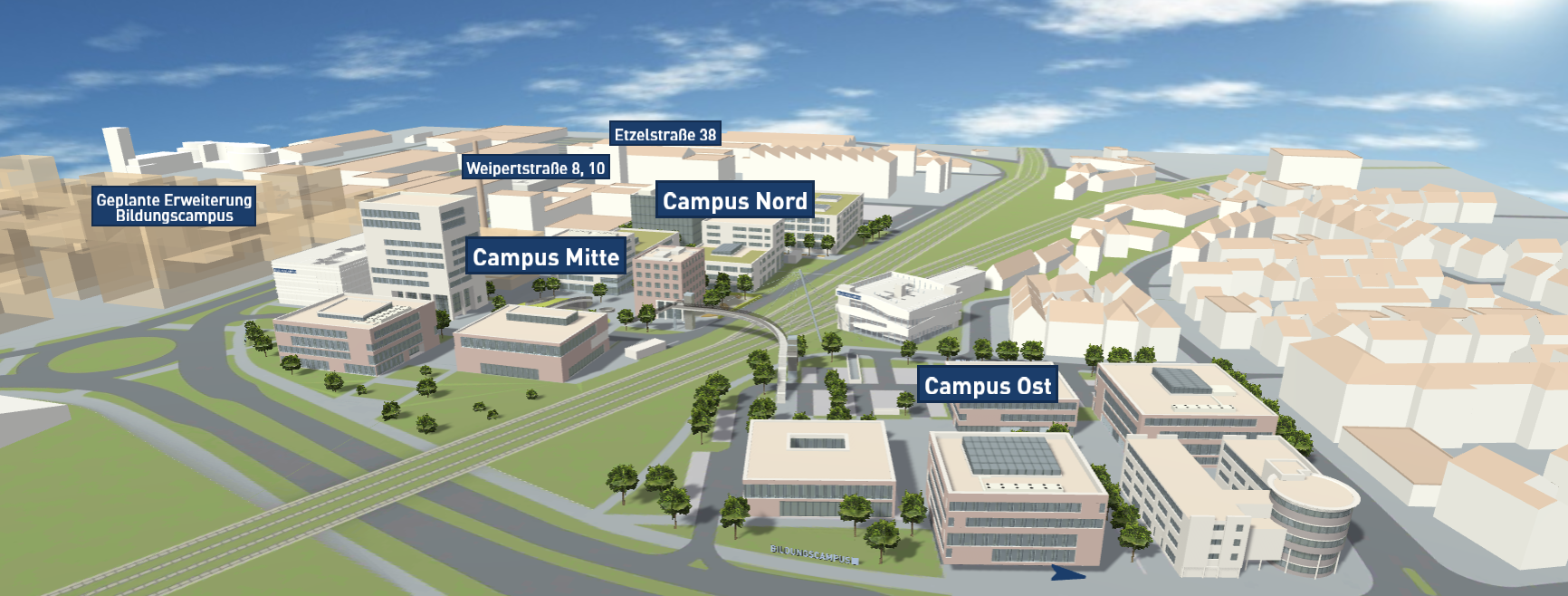 3D über den Bildungscampus Heilbronn fliegen und ihn so ganz spielerisch erkunden. Oder mit der Campus Tour im Stuhl entspannt zurücklehnen und die wichtigsten Informationen gezeigt bekommen.